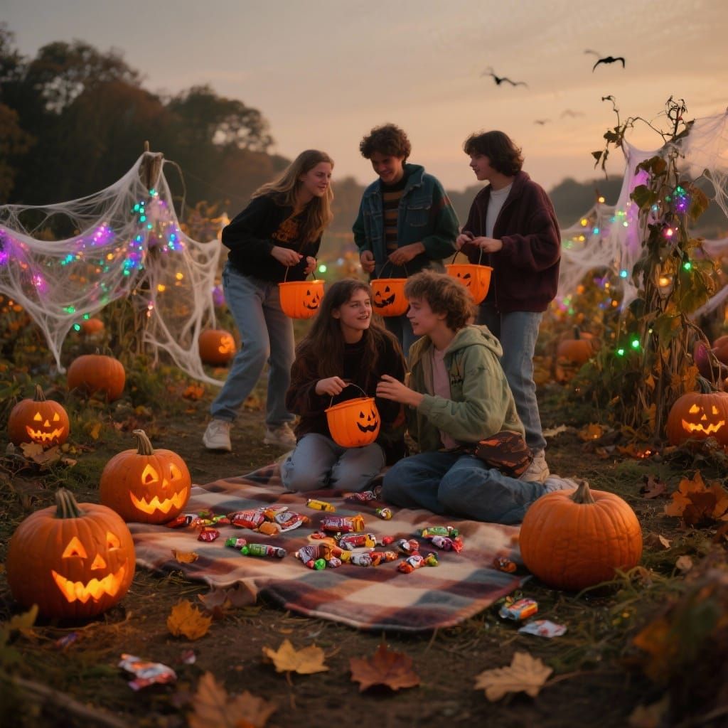 A sepia-toned photograph captures friends enjoying Halloween in a 90s pumpkin patch. Iridescent glitter and glowing jack-o'-lanterns adorn wispy cobwebs, with a picnic blanket suggesting a nostalgic, dreamlike fall scene. Photorealistic with cinematic lighting.
