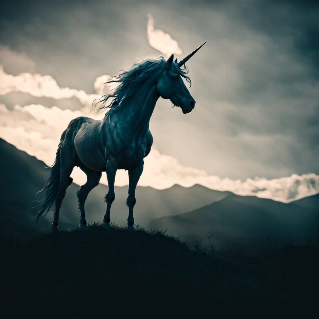 A stunning cinematic film still captures an eternal dark winged unicorn with dramatic lighting and atmospheric effects. Shot with film grain for a realistic, high-quality look.