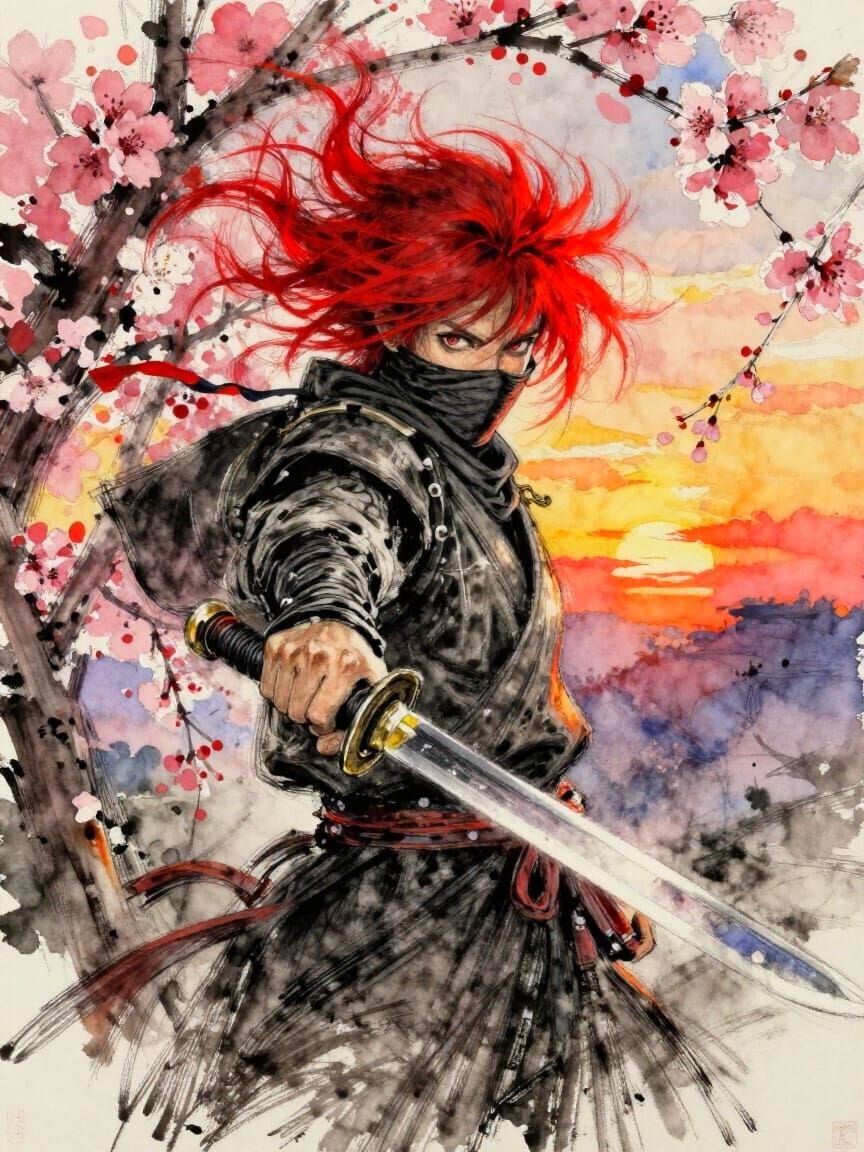 This image features a detailed sketch of a ninja with flowing red hair, holding a sword. The artwork is rendered with thick brush strokes in a maximalist impressionist style, reminiscent of gouache and watercolor.