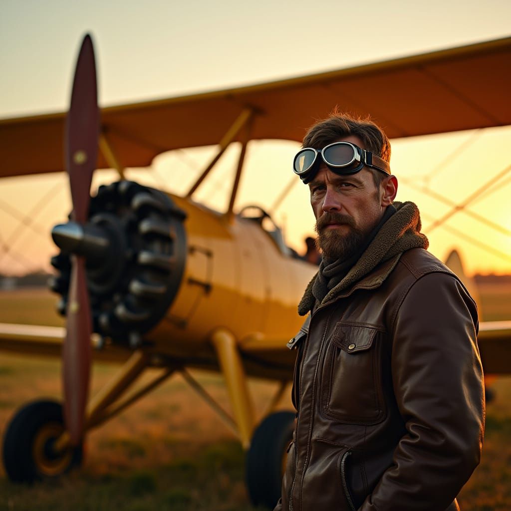 A photorealistic image showing a pilot next to a biplane at dusk. Warm colors and long shadows evoke golden age aviation photography in this cinematic scene of flight.