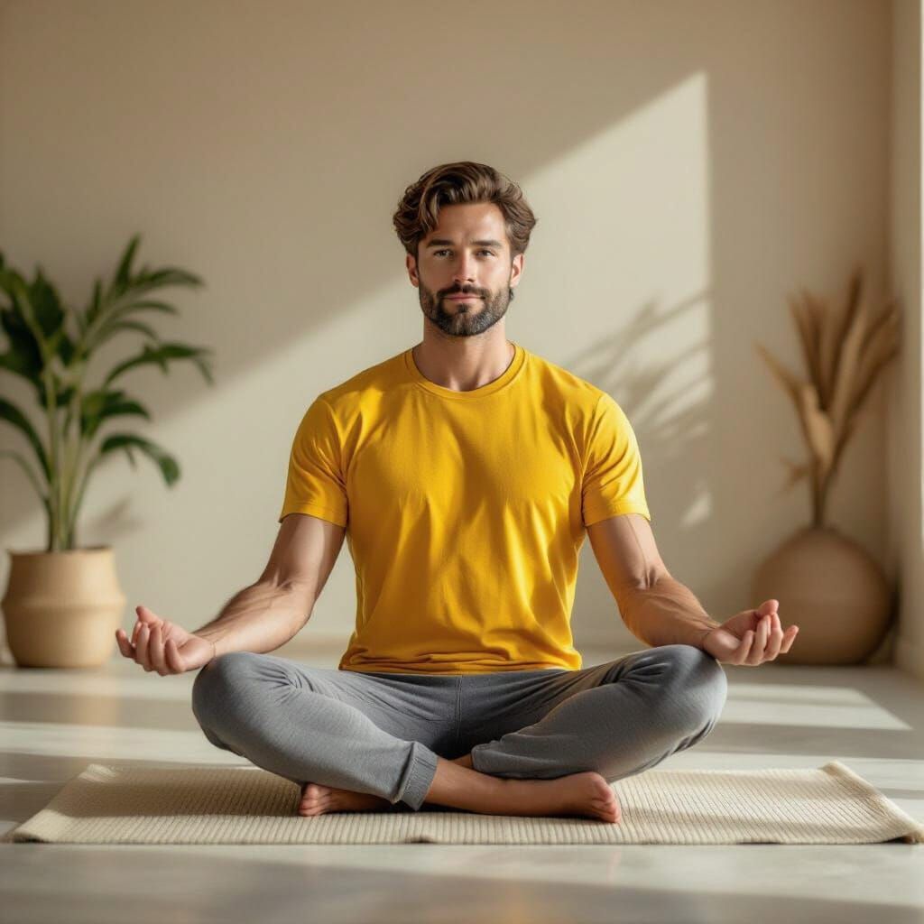 This image shows a man between 28 and 35 years old in Balasana. He is wearing vibrant yellow yoga apparel with lead gray and olive green accents in a minimalist, bright studio with photo-realistic rendering.