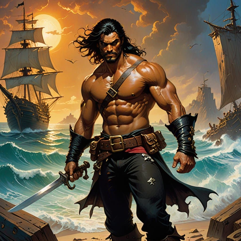This image shows a muscular man on a pirate ship deck, wielding a broadsword. The fantasy art style features vibrant colors, golden hour lighting, and dynamic composition reminiscent of classic adventure illustrations.