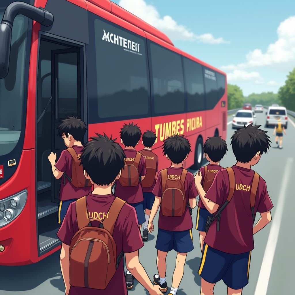 This image shows energetic boys excitedly boarding a sleek red bus with a bold anime aesthetic, reminiscent of Japanese Manga and digital art, with exaggerated expressions and dynamic movement.