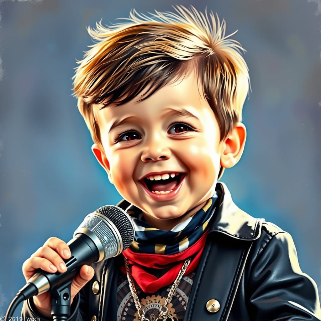 A one-year-old cute boy with a smile on his face, attractive eyes, a rock star, a lead singer singing live into a microphone, a complete body, pop surrealism, depth of field, a slightly tanned face, quirky, whimsical, and lively, Ink and watercolor oil painting by James Gurney