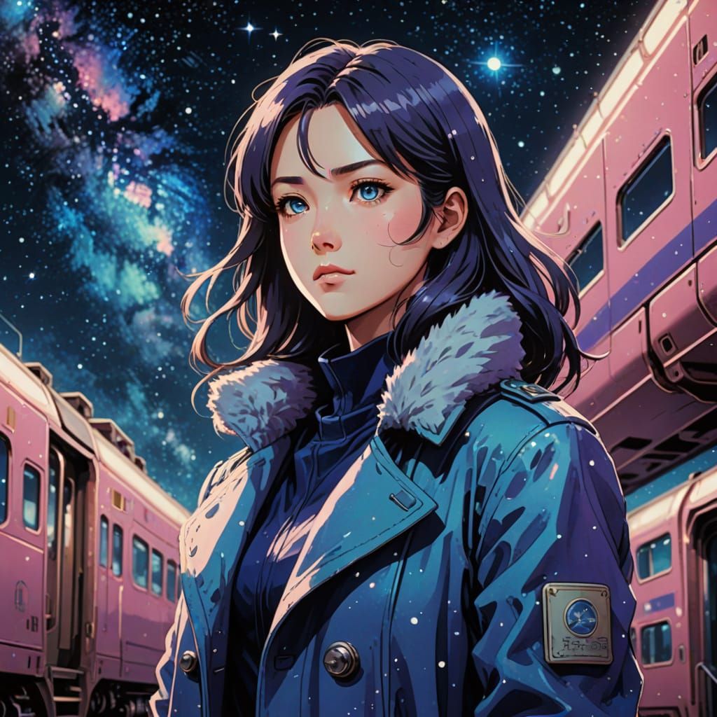 This image shows a woman standing near a space train under a starry sky. The vintage anime art features soft focus, luminous blue eyes, a fur-lined coat, and a nostalgic, sci-fi ambiance.