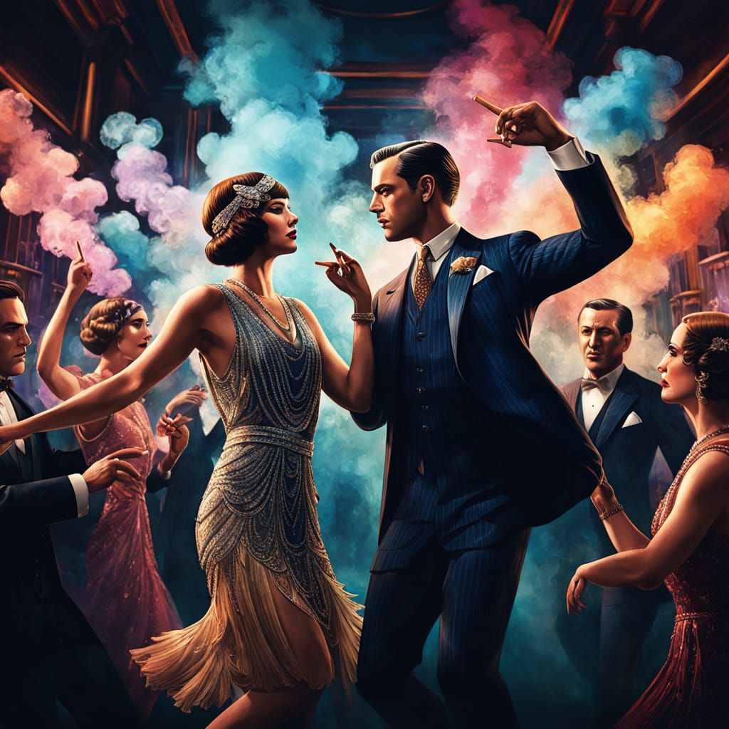 A vibrant image of a 1920s cabaret scene with gentlemen in suits and flapper women dancing on stage. The digital artwork features dramatic lighting and a colorful art deco background.