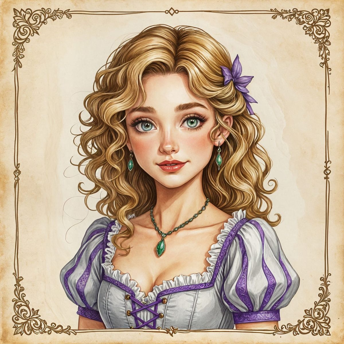 A young noblewoman with green eyes and blonde curls, dressed in gray with purple accents. Rendered in an antique, hand-drawn ink watercolor style with painterly textures.
