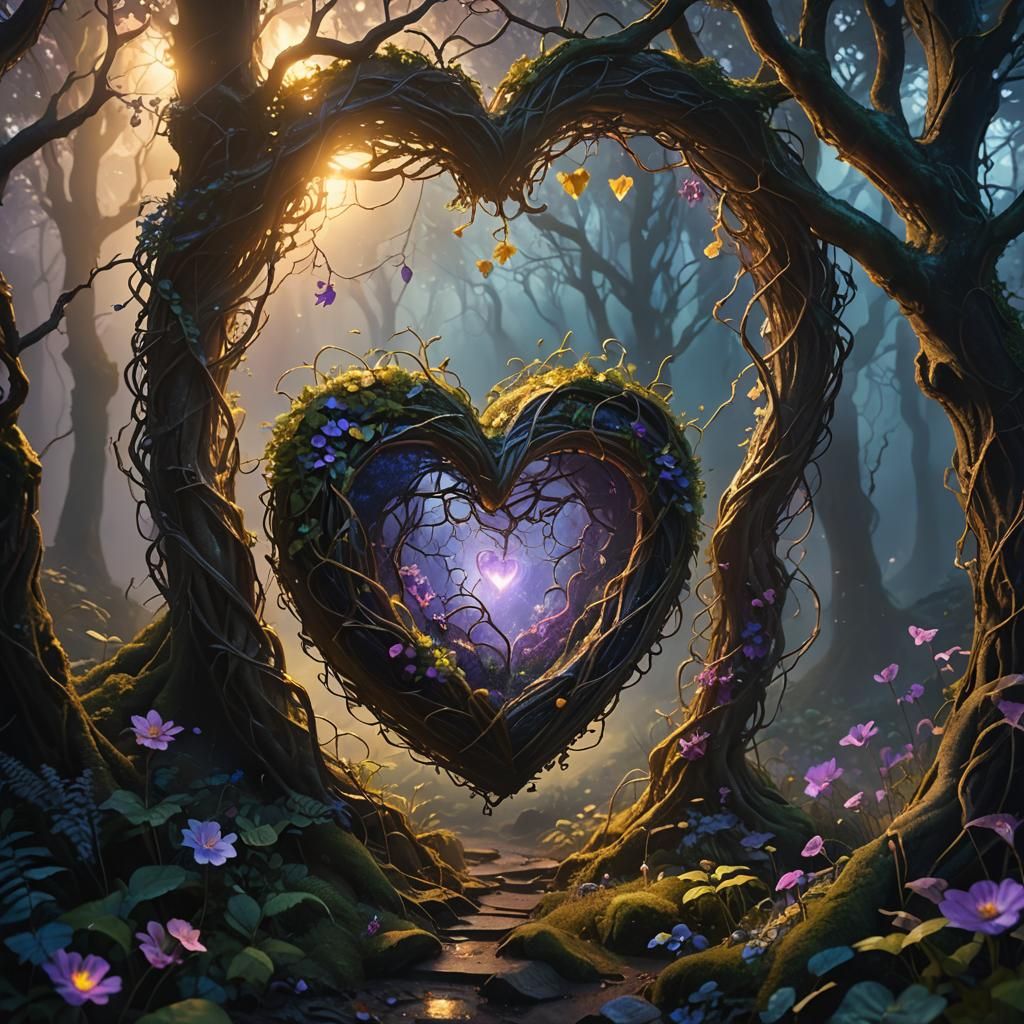 A striking picture of a glowing, heart-shaped portal in a misty forest. Vines and flowers surround the portal as a figure enters its golden light. This fantasy landscape is rendered with hyper-realistic detail.