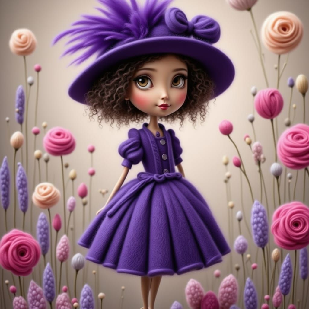 This AI-generated image shows a full-body portrait of a cute young girl in a Victorian purple dress and feathered hat, with roses and lavender in the background.