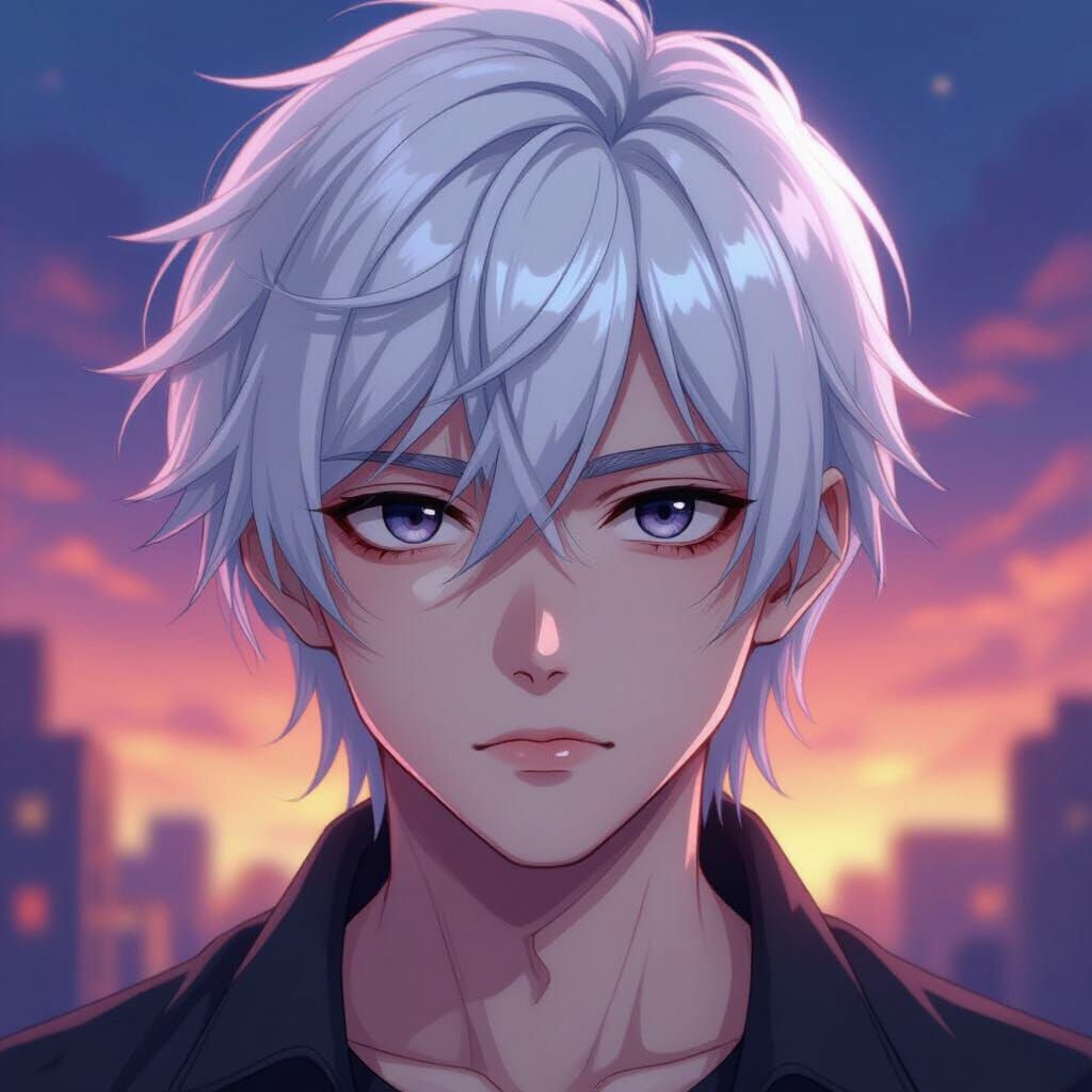 A digital rendering of a slender man with long white hair and dark eyes. The figure has pale skin and a tired expression, set against a colorful background in a cel-shaded anime style.