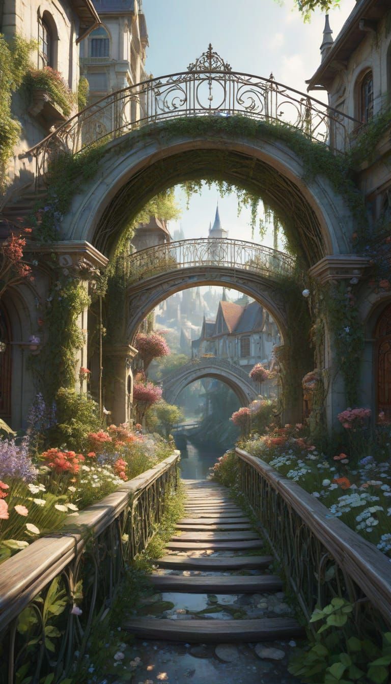 A hyperdetailed image of a fairytale art nouveau bridge leading to an Elven village. The scene features tall, spired buildings, vines, flowers, and a rococo aesthetic in vivid colors.