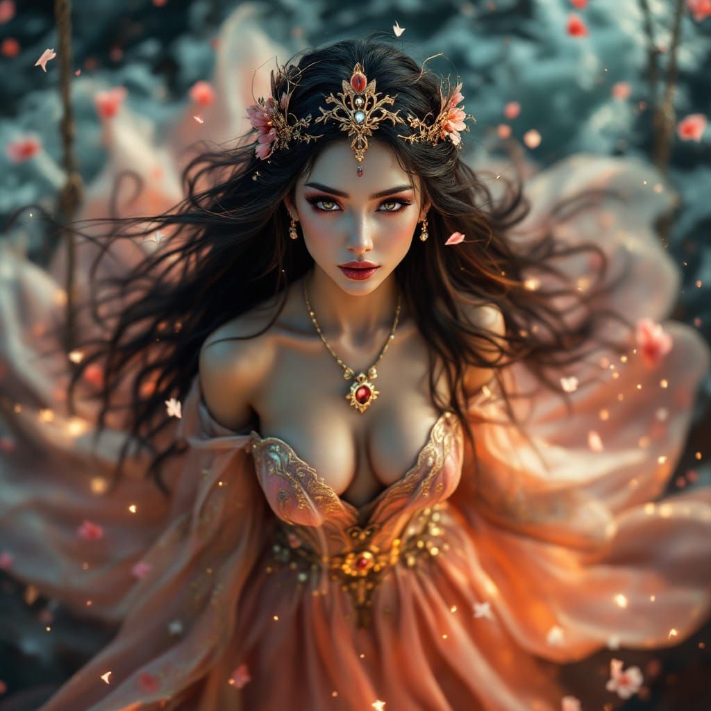 This image showcases a mature sea goddess princess in an anime-realism hybrid style. She stands on her ship's deck, adorned in an ornate gown with flowing hair and glowing jewelry.
