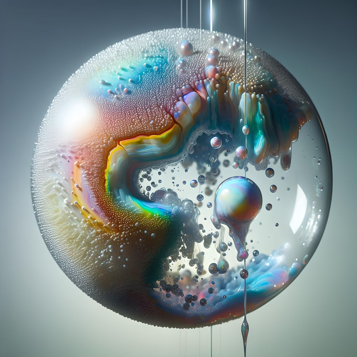 A mesmerizing display of fluid art featuring a dissolving core within an opal-like bubble. The image captures an accidental yet captivating flow with vibrant colors and textures, as 3D digital art.