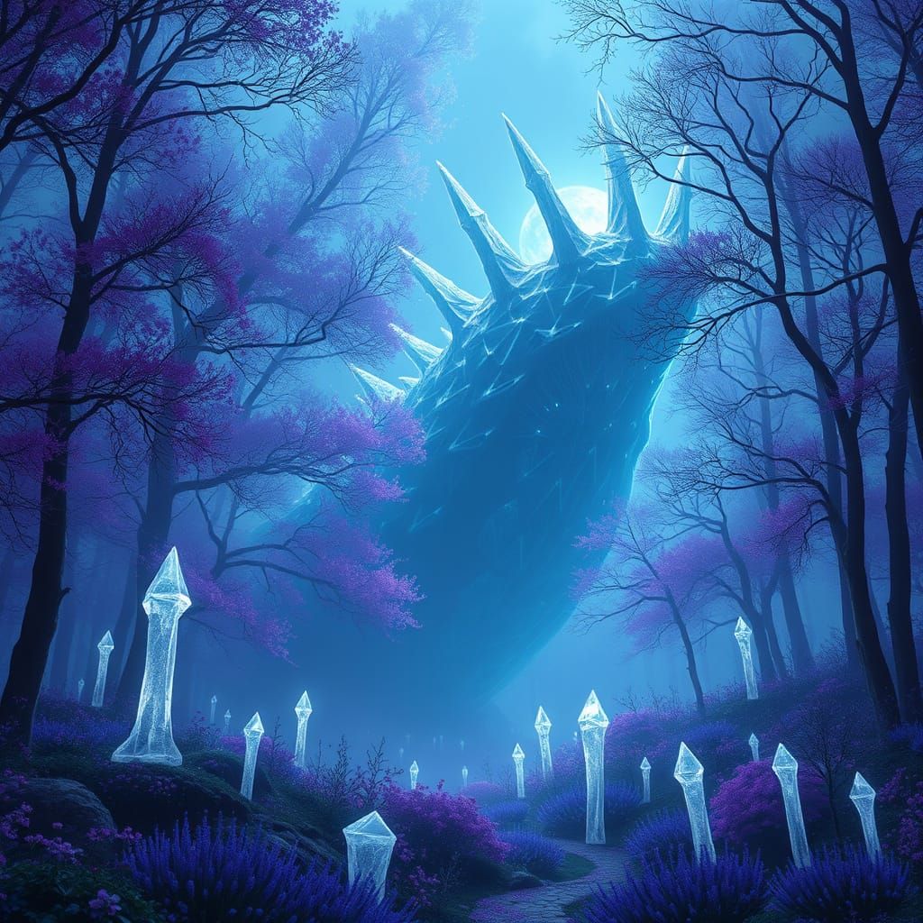 A striking picture of a mystical, violet forest with luminous trees in shades of purple and blue. Huge, toxic tentacles of a sea monster emerge from a misty ocean in a dark, organic style.