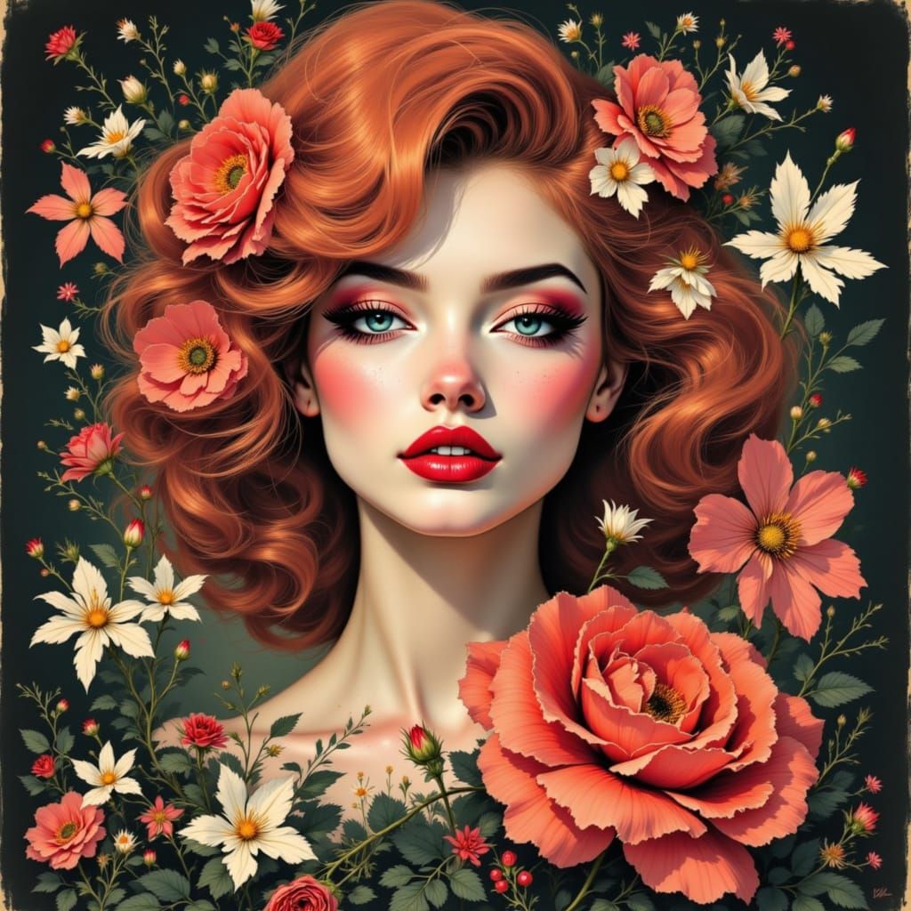 This image shows a figure with floral elements. The artwork features elements of Japanese Ink Brush painting, and pin-up art in a VivaFlow style.