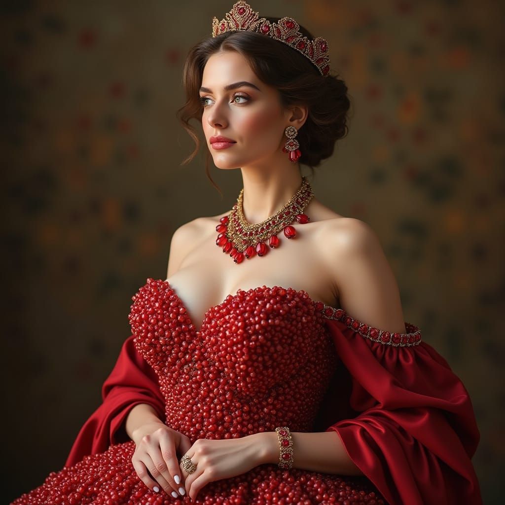 A realistic portrait of a plus-size woman wearing an elegant gown made entirely of pomegranate seeds, detailed with matching jewelry. Features soft lighting and a cinematic photographic style.