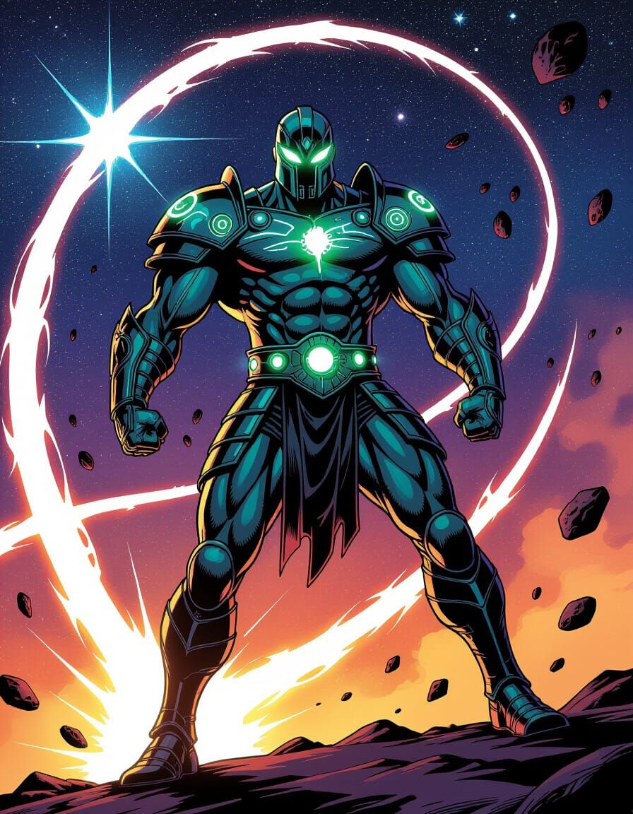 This image shows an alien gladiator in a heroic pose, armor glowing with cosmic energy. Rendered in a dynamic, painted style that emphasizes power and grandeur.