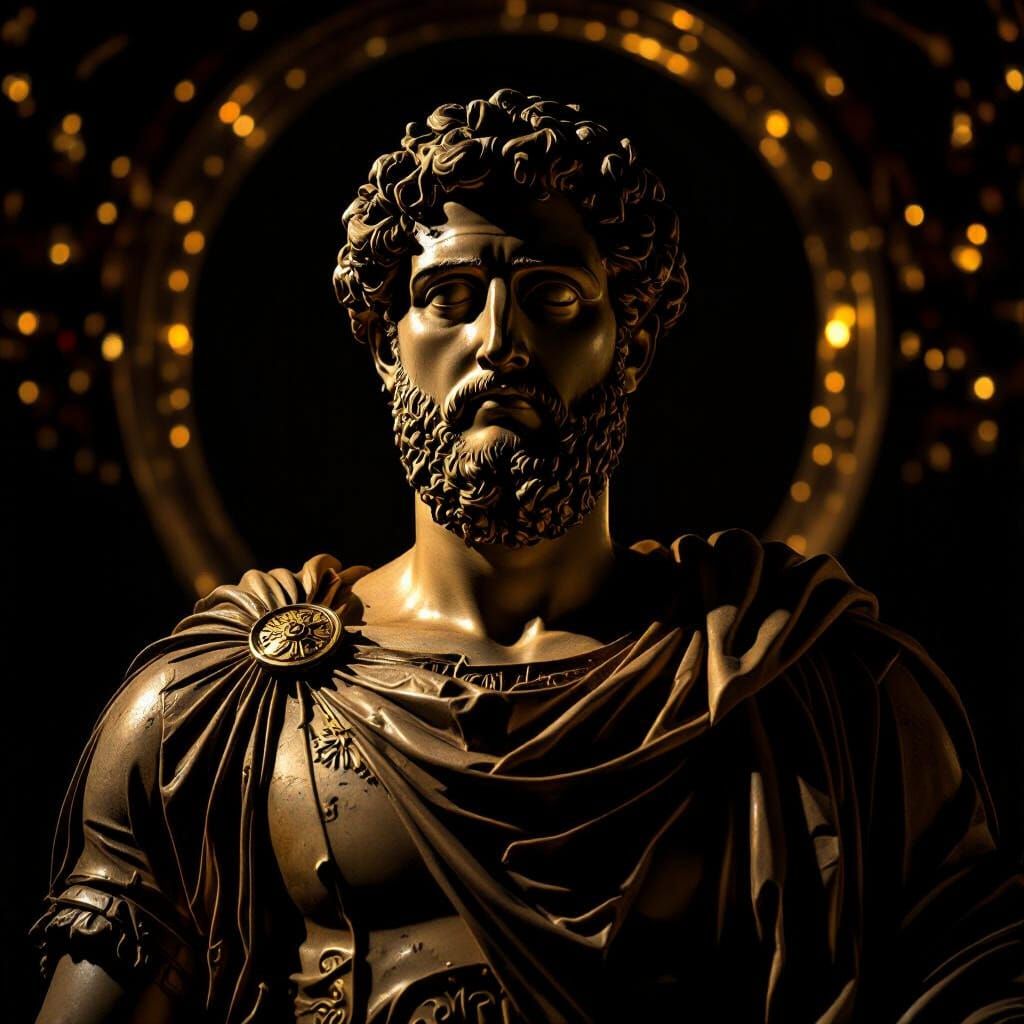 This image features a statue of Marcus Aurelius with a dark luxury aesthetic. Dramatic lighting and deep shadows highlight intricate details, evoking opulence and mystery with a rich, painterly finish.