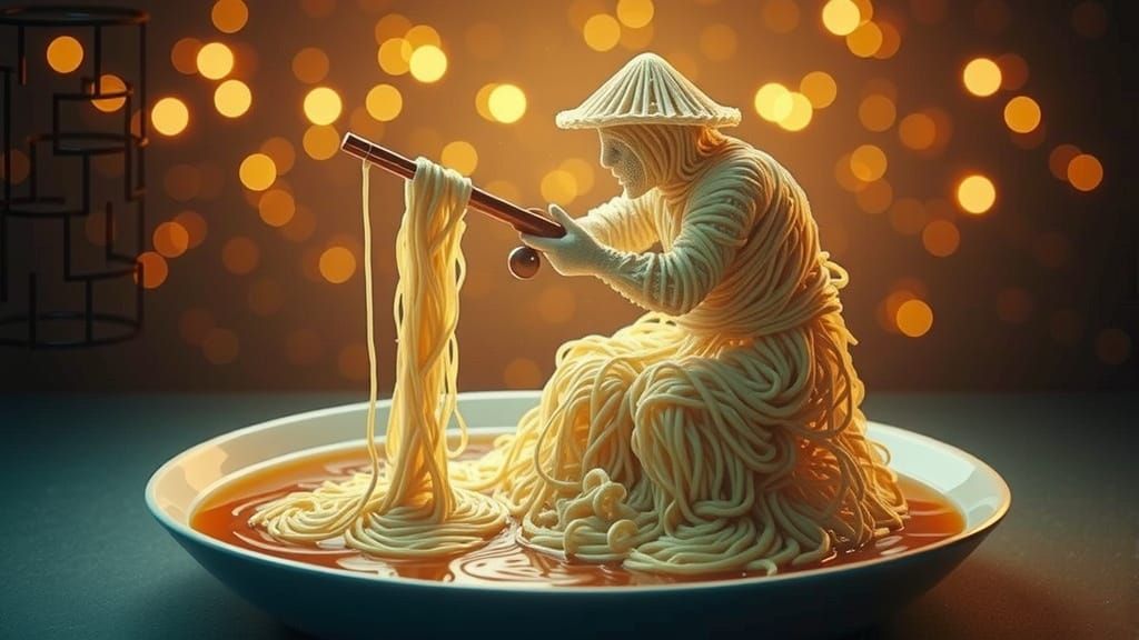 This whimsical image depicts a fisherman constructed entirely from noodles, seated within a noodle bowl and actively fishing for more noodles.