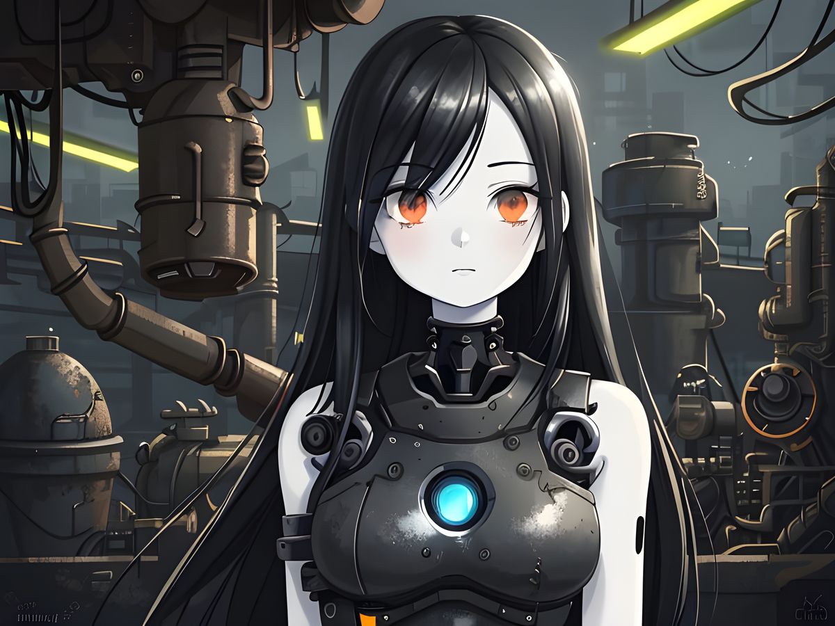 This image shows a pale-skinned girl with black hair in an industrial setting. The scene is surreal, with robot arms and shoulders, intricate mechanics, and detailed robot parts.