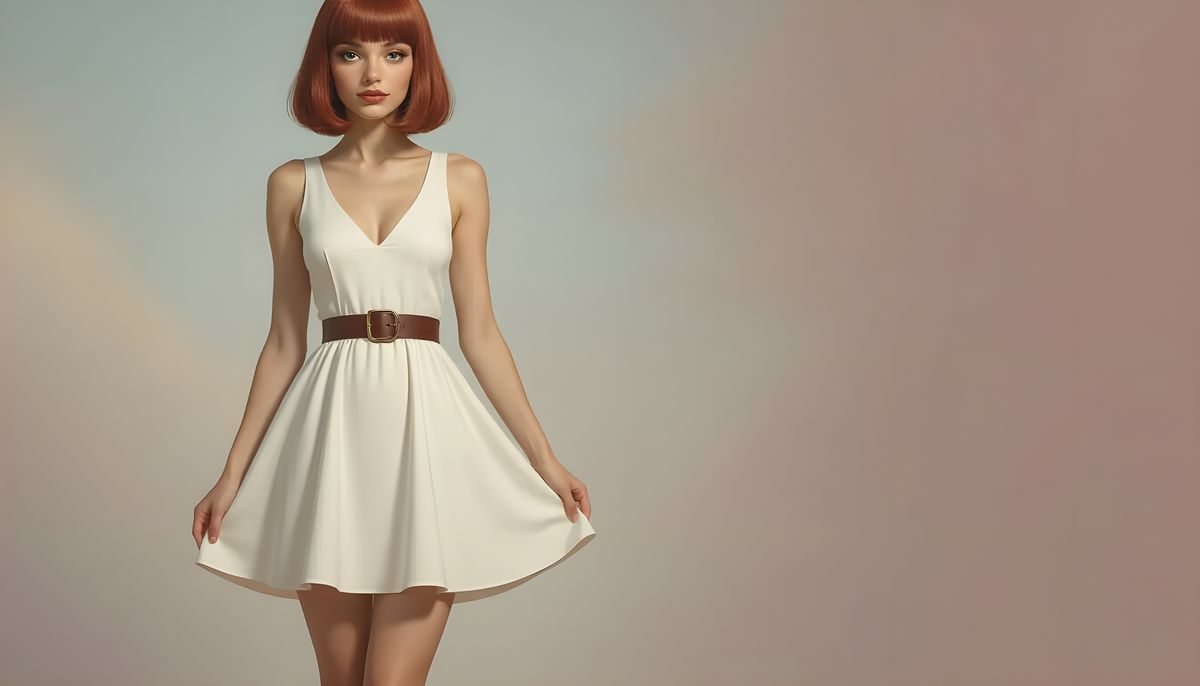 A full-body portrait of Loxy Isadora Bliss in a white summer dress with a dark belt, featuring a sleek auburn bob and a confident expression against a pastel gradient background.