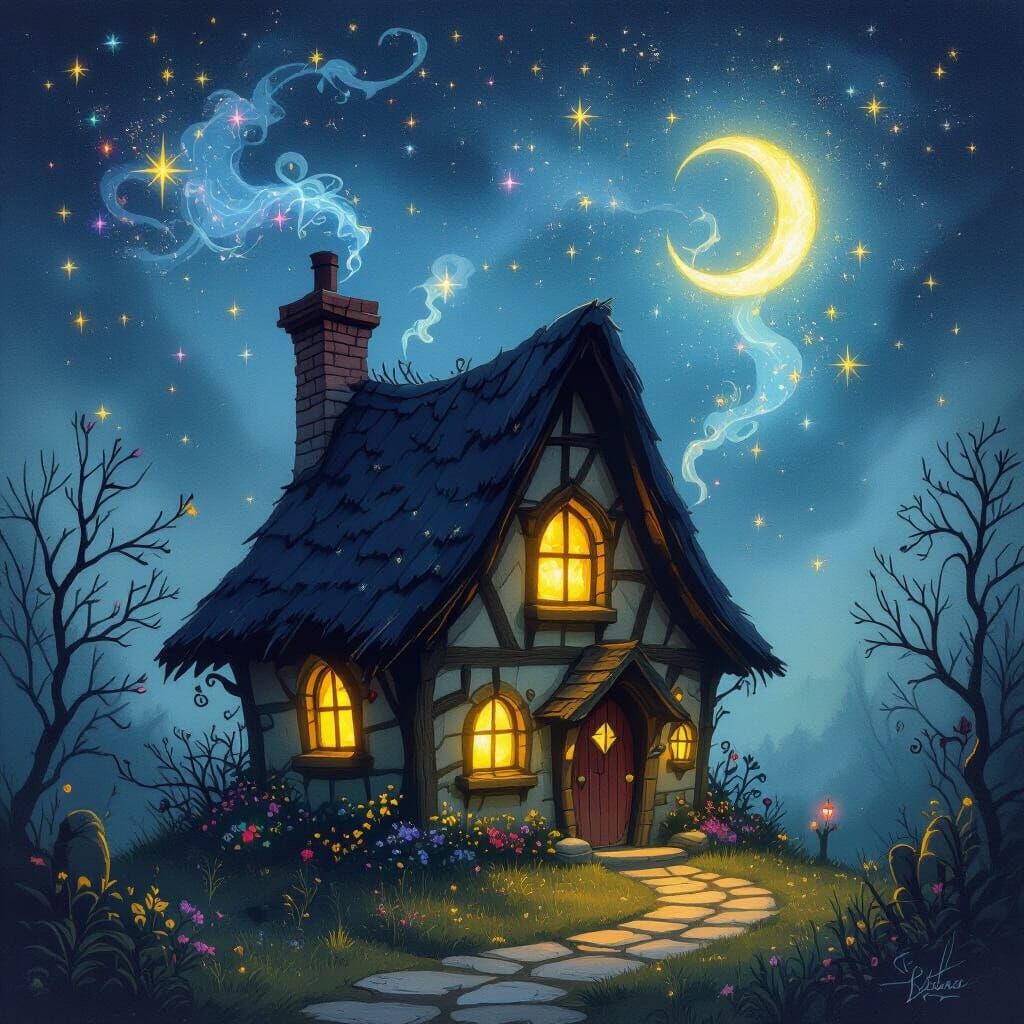 A crooked witch's cottage glows warmly under a misty, starry night. Magical sparkles drift into the air in a vibrant storybook illustration style.
