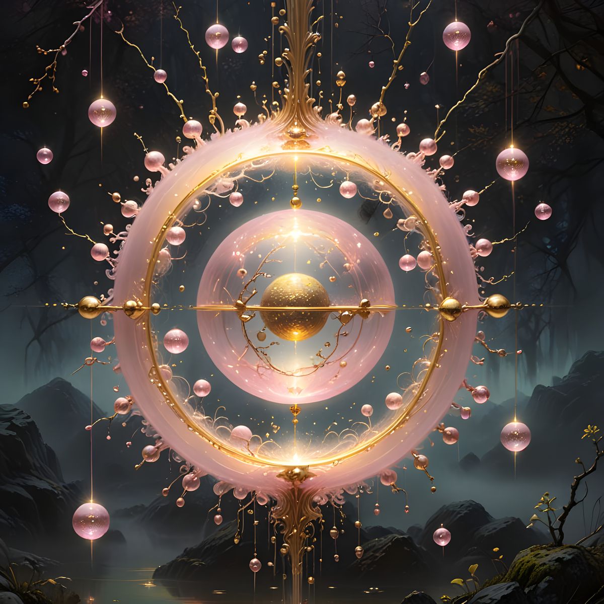 This image shows an abstract landscape with golden spheres in a misty environment. The artwork features bioluminescent neon colors and intricate vertical lines, reminiscent of a watercolor and ink spread art with a soft, warm color palette.