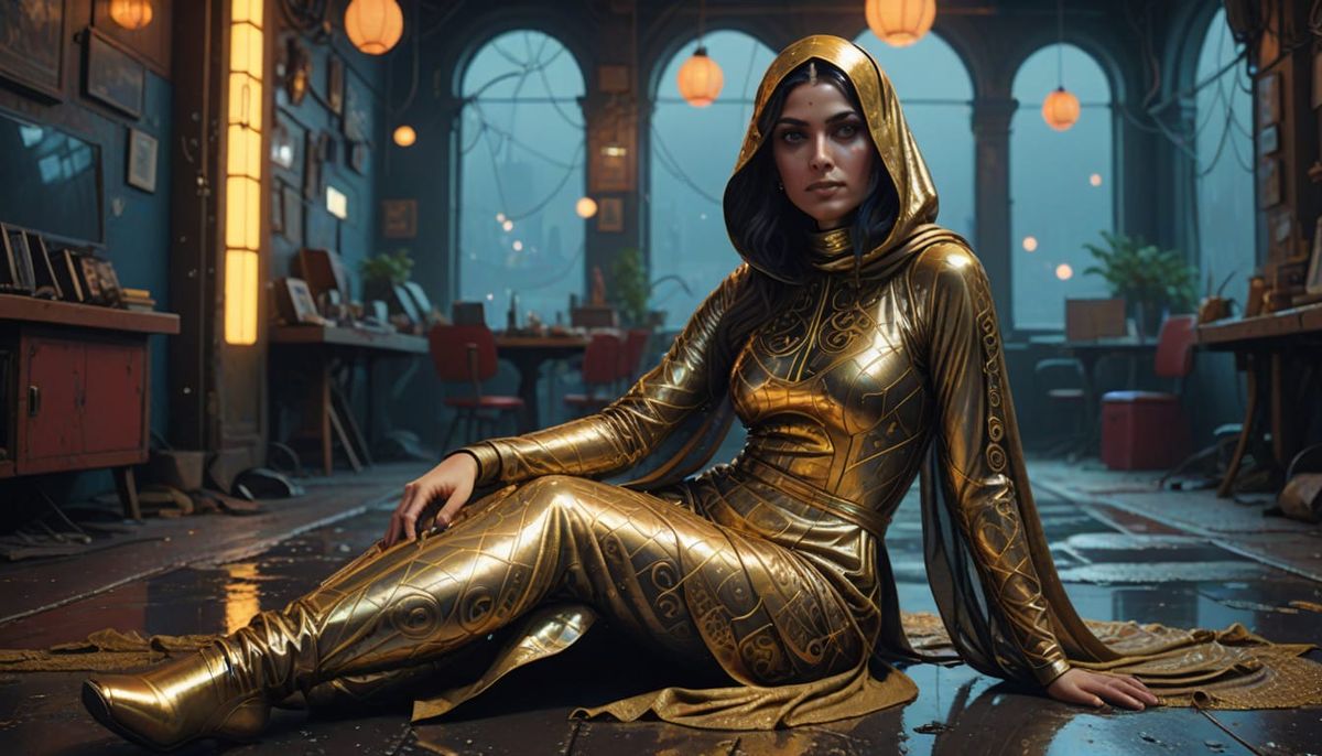 This image shows a striking, confident woman with a toned physique, wearing a modern, avant-garde latex burqa and a gold lamé dress, exuding self-assurance and beauty, in a vibrant, fantastical setting with deep, rich colors and bold, complementary hues.