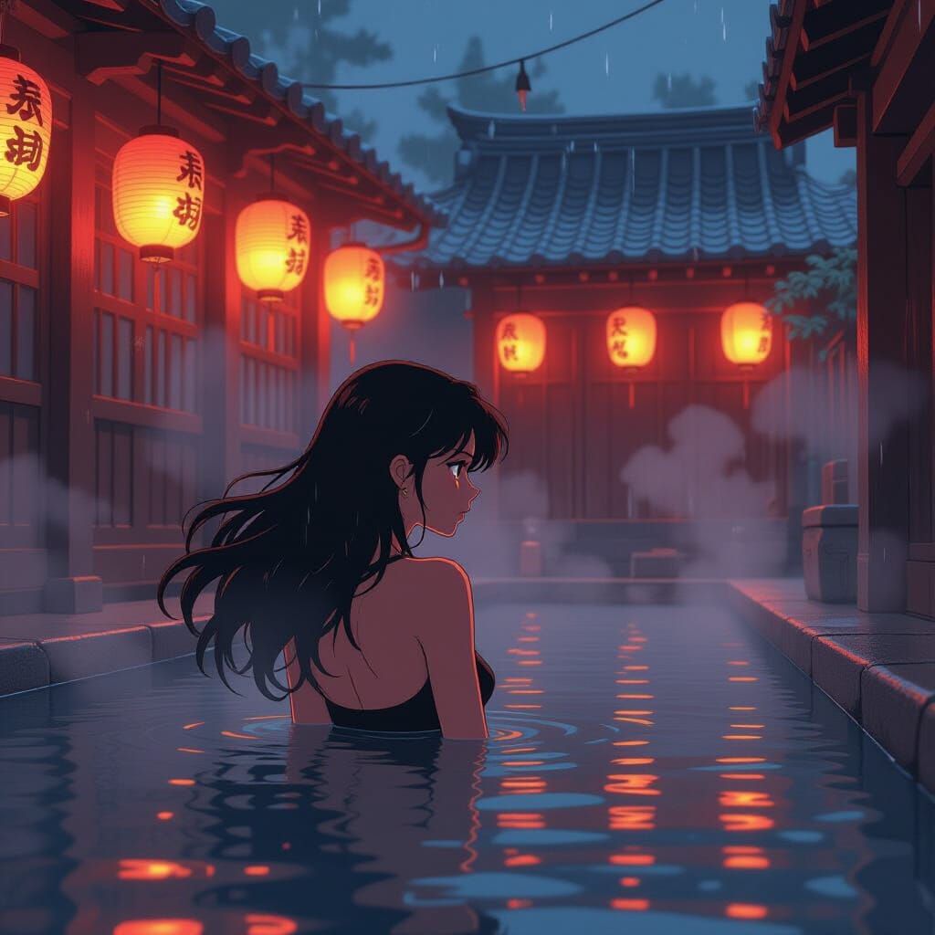 This image captures a 90s anime-style poster of a woman in a San Francisco Japanese bathhouse. Warm lantern light reflects on wet stones, with mist rising from steaming water, evoking a nostalgic atmosphere.