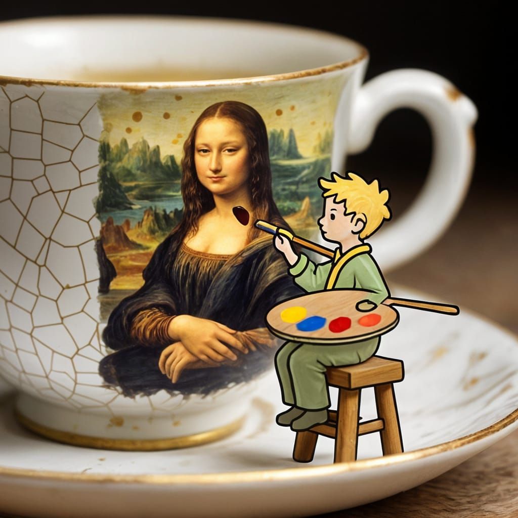 A close-up, ultra-photoreal macro photograph of a tiny little prince artist(flat 2d line doodle) sitting on a miniature wooden stool, meticulously painting the Mona Lisa with museum-grade oil textures and visible craquelure on a giant teacup. The miniature painter holds a realistic round palette with ...