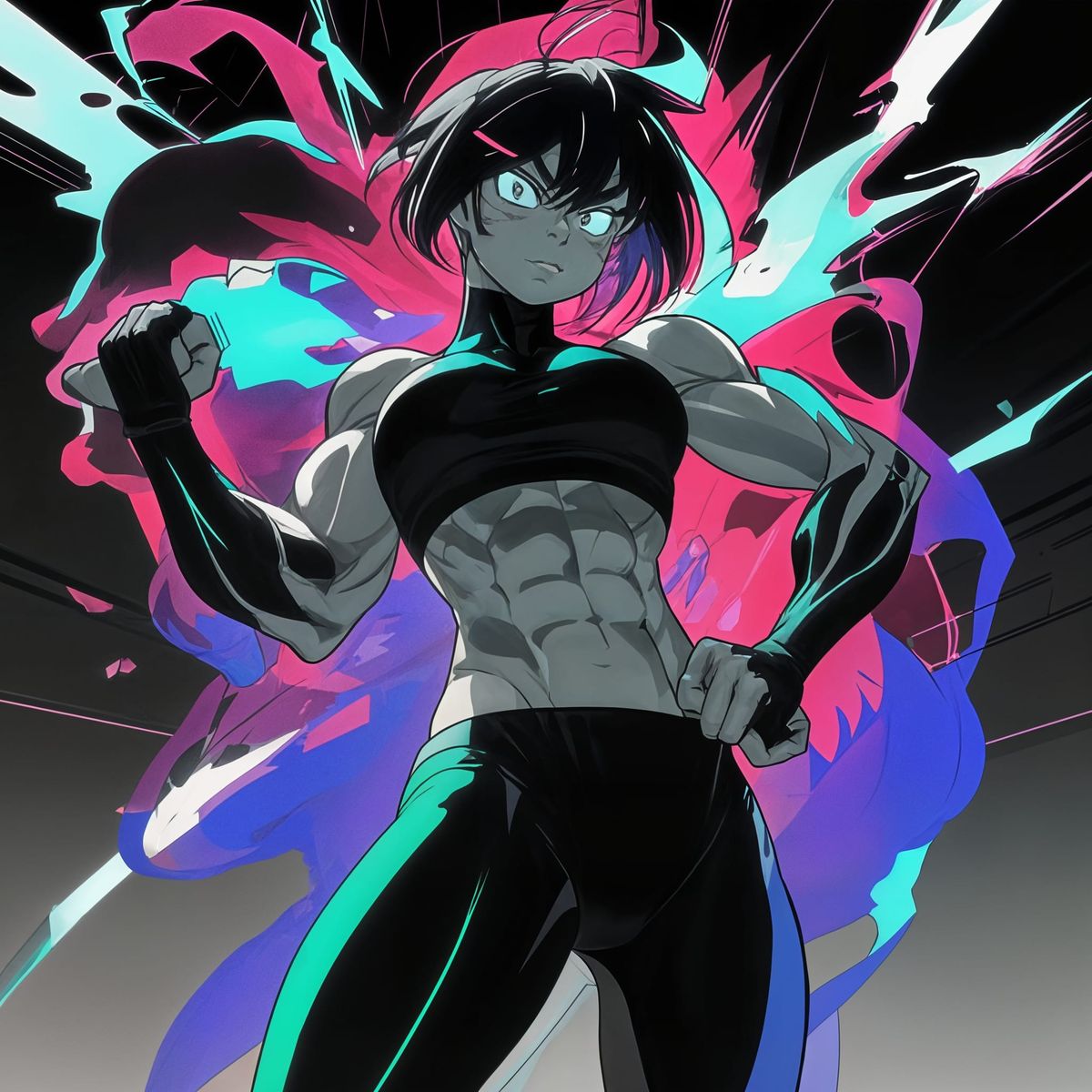 This image showcases a strong, athletic woman in a dramatic, cinematic setting, with a focus on her toned physique and striking abs, reminiscent of anime and manga art styles.