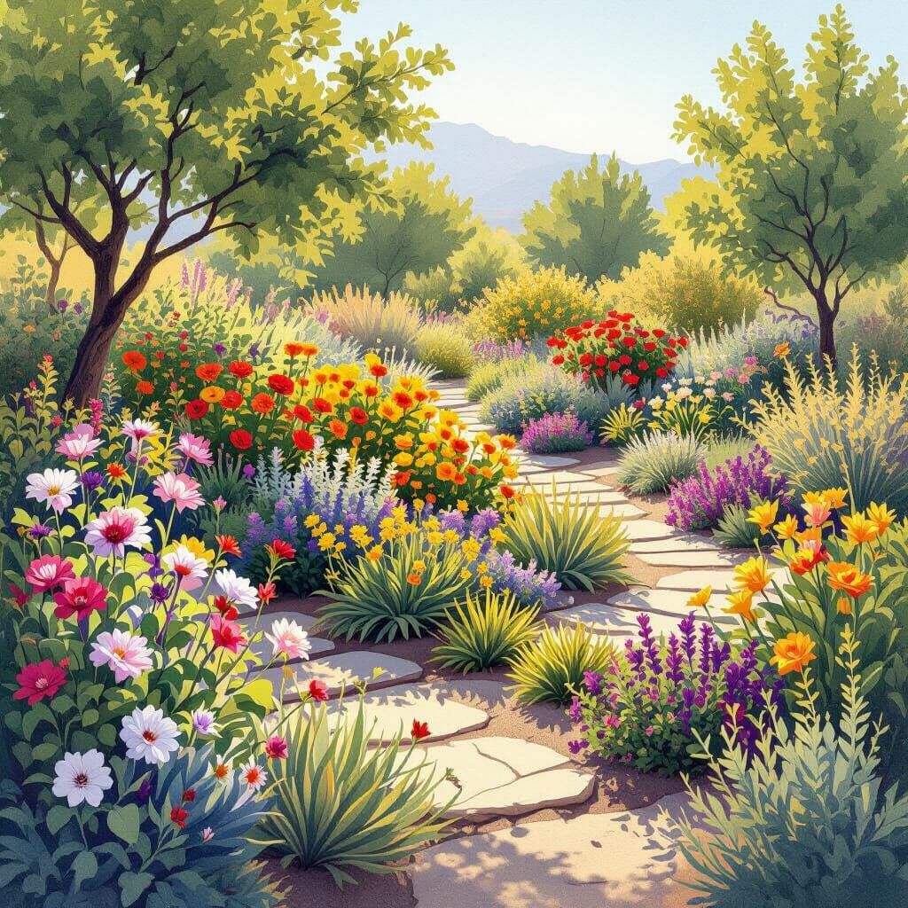 This image shows a xeriscape garden design with plants organized by water requirements, featuring bright, natural colors and distinct zones. Illuminated by soft sunlight, it serves as an educational display, rendered in a detailed botanical illustration style.
