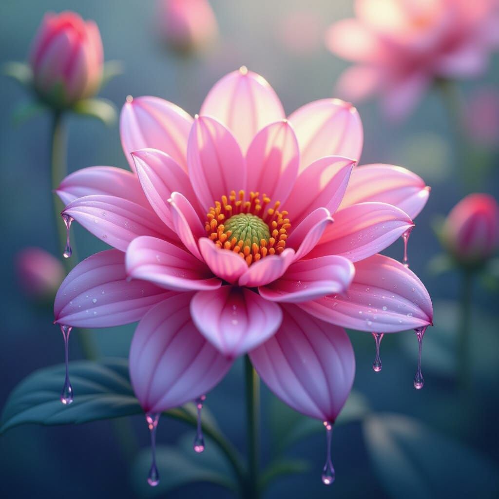 A softly focused, highly detailed flower with vibrant, dripping watercolor petals. This image evokes fantasy concept art with rich colors and intricate details, rendered in 8k resolution.