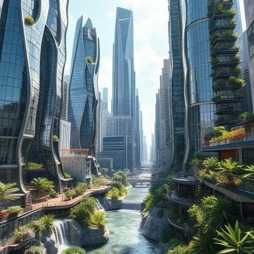 This digital painting showcases a breathtaking, utopian vision of New York City. Soaring skyscrapers feature curved glass, solar panels, and integrated vertical gardens, bathed in golden hour light.