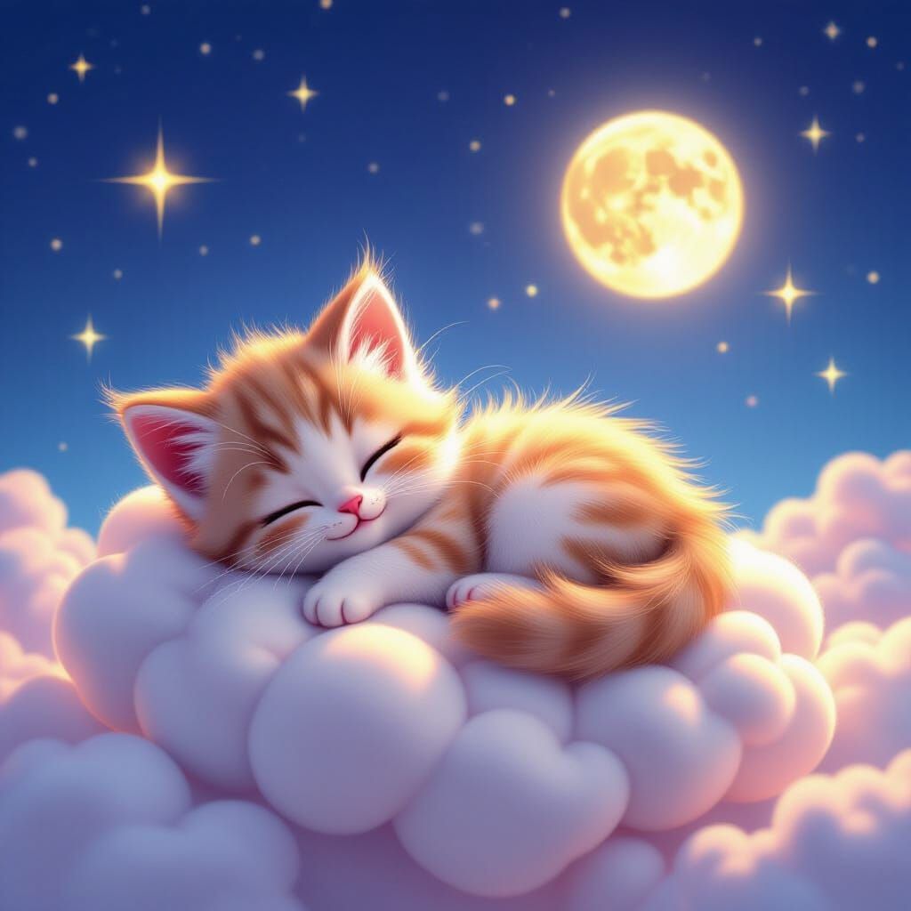 This image shows a fluffy kitten asleep on a soft cloud with the moon and stars. Rendered in a vibrant 3D digital art style with rich colors and cinematic lighting.