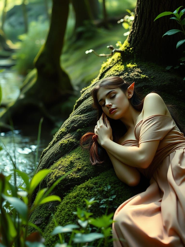 A serene image of an elf sleeping by a stream in a lush forest. This cinematic image, reminiscent of a film still, features rich color grading and atmospheric lighting.