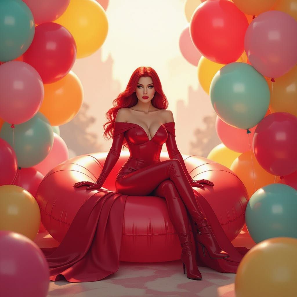 This image shows Scarlet Witch in her iconic red costume sitting atop a giant birthday balloon. The scene is filled with oversized, brightly colored balloons in a whimsical style.