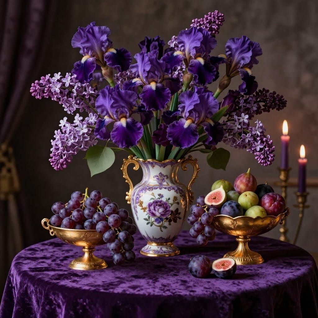 This image showcases a lavish baroque table setting featuring a purple and gold vase filled with dark purple flowers, alongside a gilded fruit bowl. Dramatic candlelight highlights the opulent textures and rich colors.