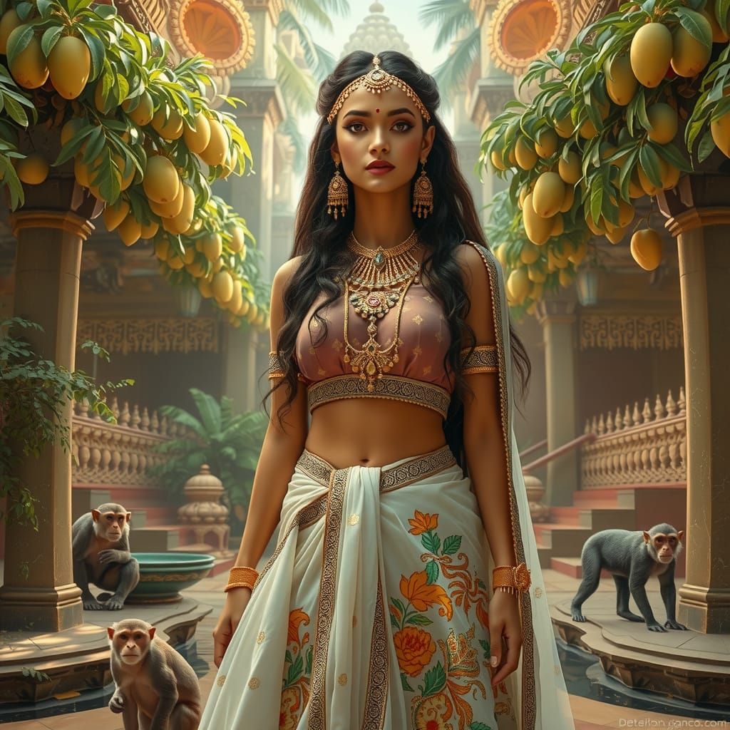 Full body, Beautiful Indian princess, chesty full-bosomed, covered by an embroidered saree, covered by a lehenga adorned with intricate embroidered golden Indian symbols, and intricate Indian jewels, intricate hairstyle with golden jewels, in delightful temple Indian garden with mango trees, monkeys, ...