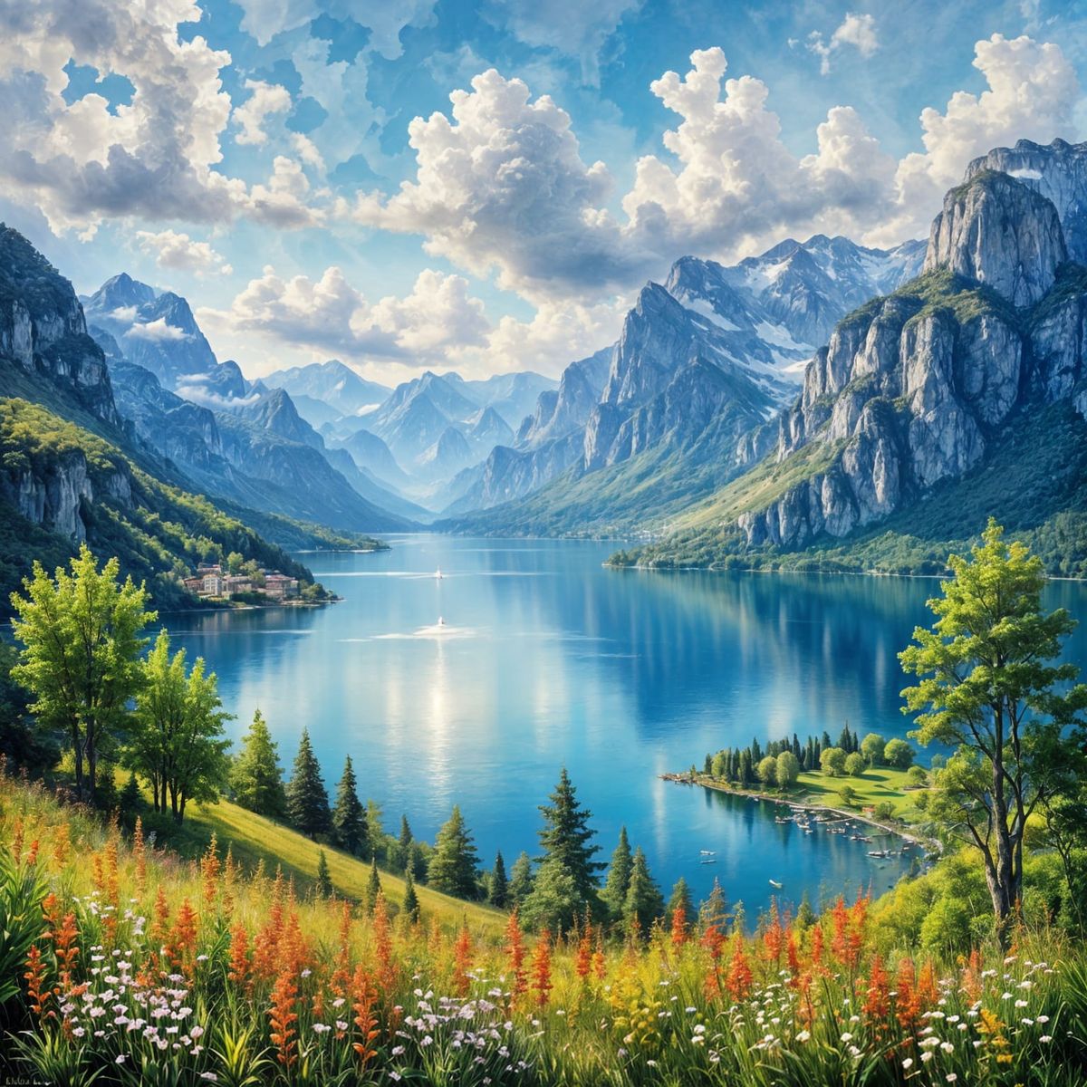 In the embrace of crystal peaks, day breaks over a sapphire world. A sanctuary of greenery and flowers where every breath is a promise of renewal.... Dans l'étreinte des monts de cristal, le jour se lève sur un monde de saphir. Un sanctuaire de verdure et de fleurs où chaque souffle est une promesse de renouveau.....
