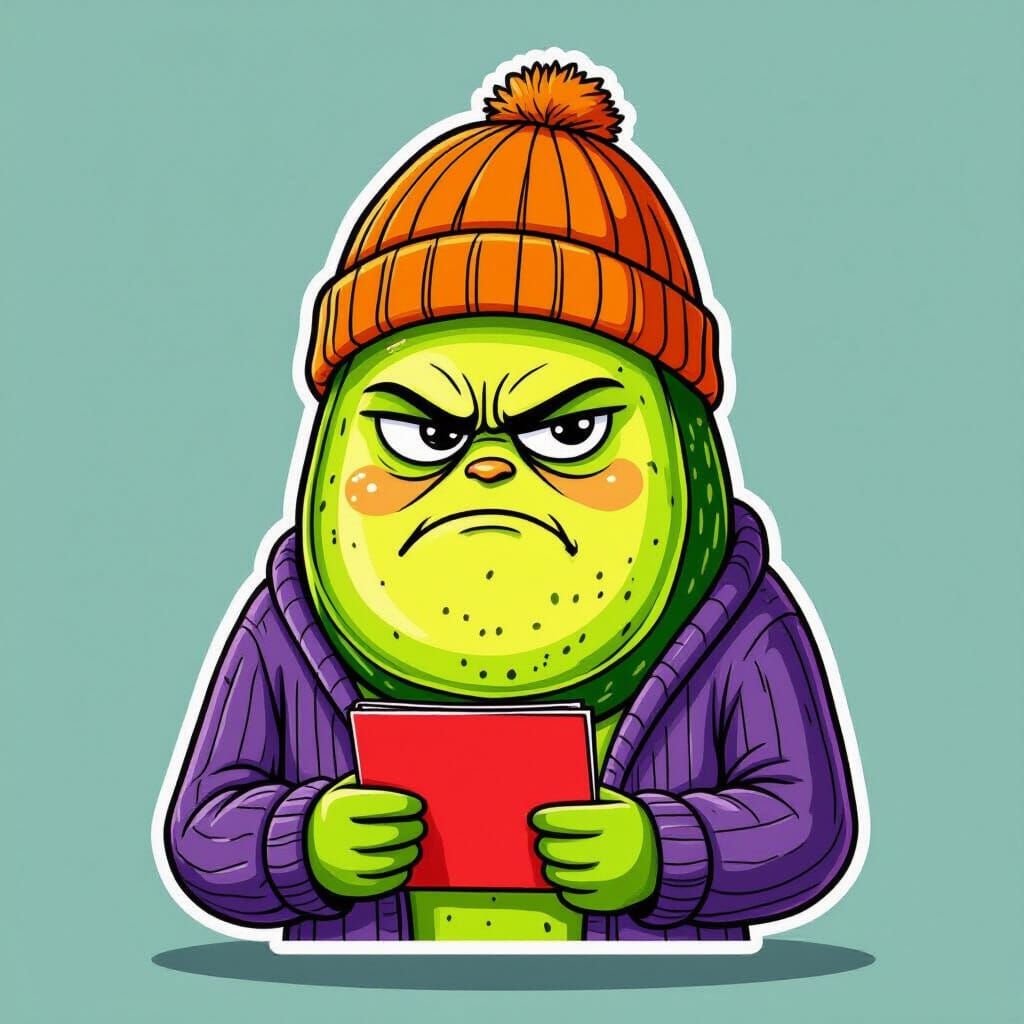 This detailed sticker features a scowling avocado character with a body, wearing an orange beanie and purple cardigan, holding a red card. Rendered in vibrant colors with subtle texture, inspired by vector art.