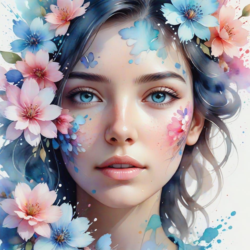 This image is a beautiful close-up portrait of a woman's face, delicately overlaid with blooming flowers in soft focus, set against a textured watercolor background with pastel colors and gentle gradient.