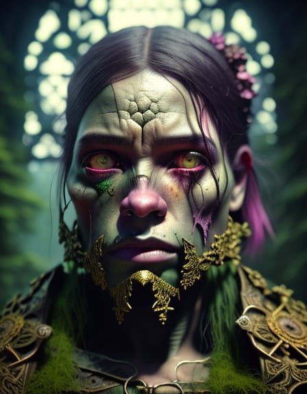 A close-up image in the gothic art style of a trapped girl seeking help, set during the golden hour. The fantasy painting features filigree details, mossy giants, and deformed shapes in green and magenta, enhanced by soft lighting and high contrast to create a mysterious, surreal atmosphere.