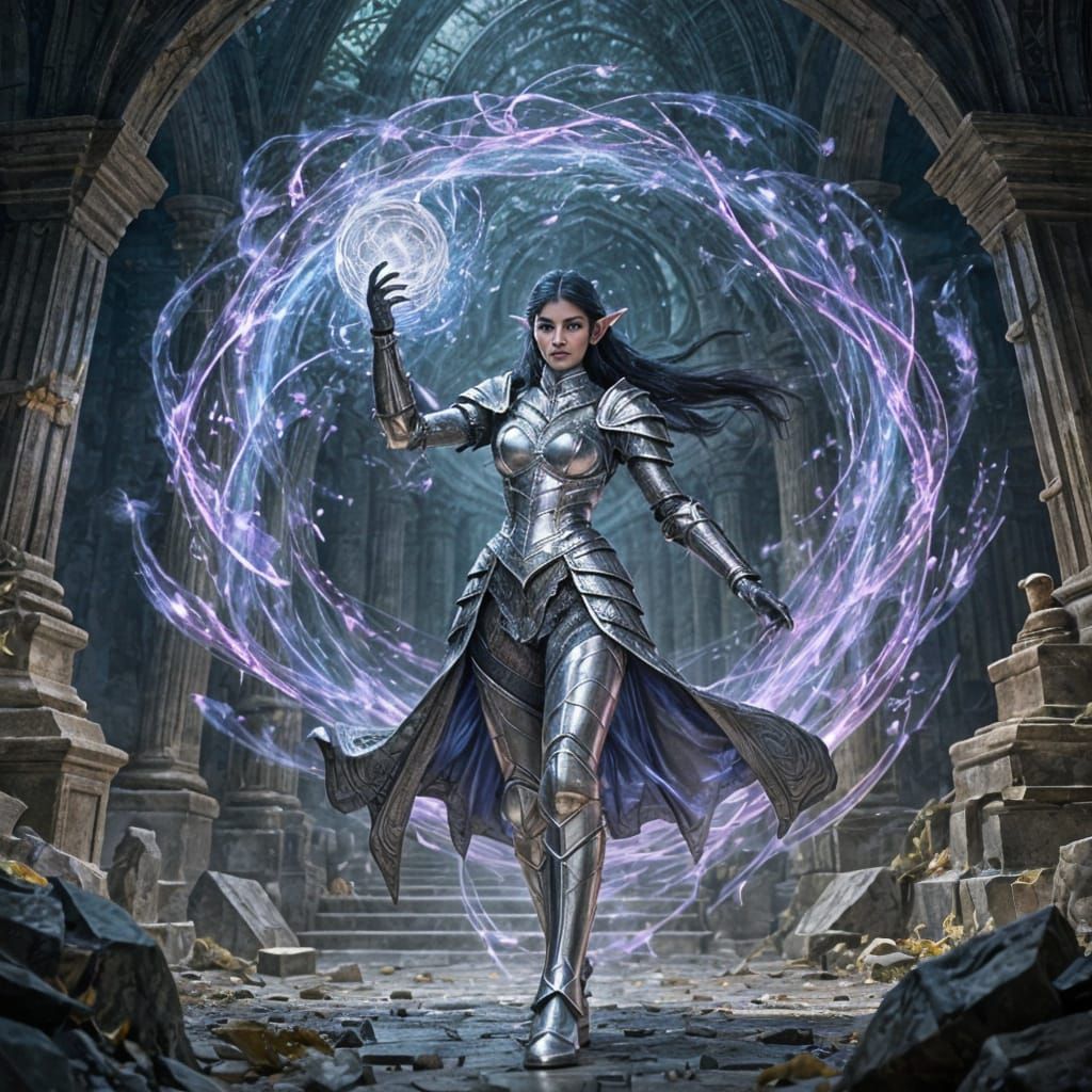 This image shows a female elf mage in detailed silver armor, creating a magical vortex amidst ancient ruins. Volumetric lighting enhances the highly detailed fantasy concept art style.