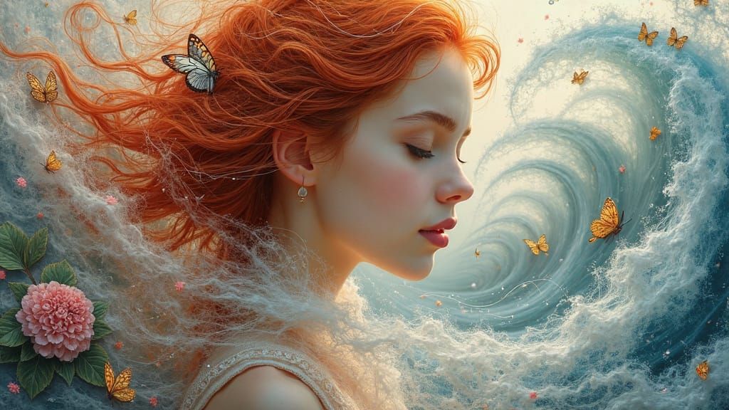 This image shows a young woman with crimson hair and a translucent dress, surrounded by floral and fractal elements. The artwork features a ghostly, transparent hologram with volumetric embroidery and neon accents.