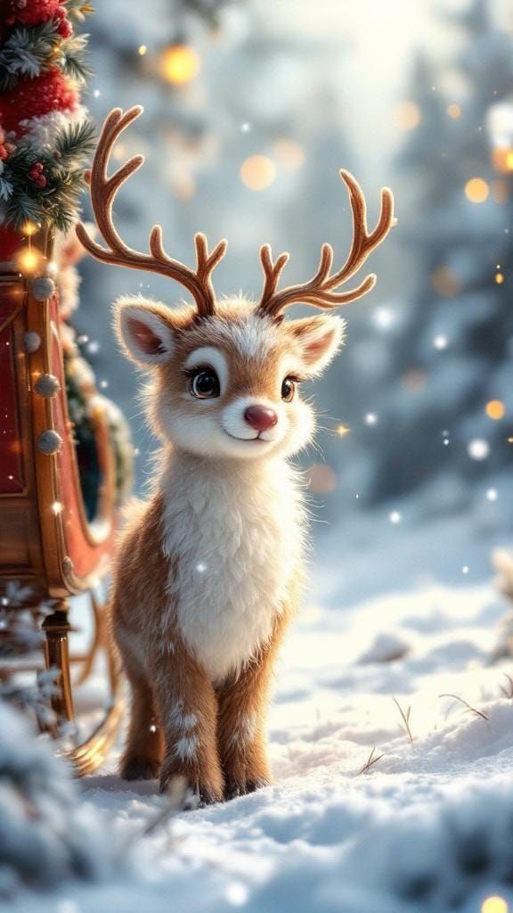 A charming image of a fluffy reindeer calf next to Santa and his sleigh in a snowy scene. The artwork features intricate textures, soft lighting and whimsical details reminiscent of classic children's book illustrations.