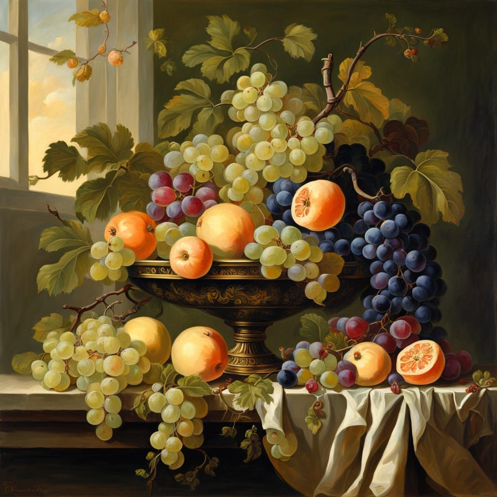 A vibrant baroque still life featuring a fruit bouquet on a table, reminiscent of Dutch masters. The oil painting style showcases lush leaves and colorful grapes in warm, golden light.