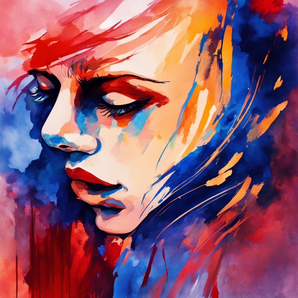 This image shows a close-up portrait of a woman turning her head. The art brut style portrait features bold colors, watercolor textures, ink drawing lines and warm lighting to convey an emotional and intimate scene.
