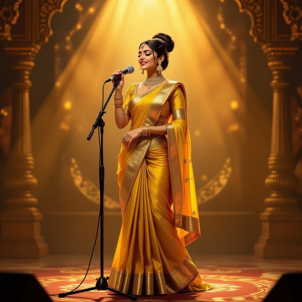 A vibrant digital painting of an Indian woman singer in a yellow salwar kameez, performing on a stage with intricate motifs. Lit by warm, golden light, evoking classical Indian music.