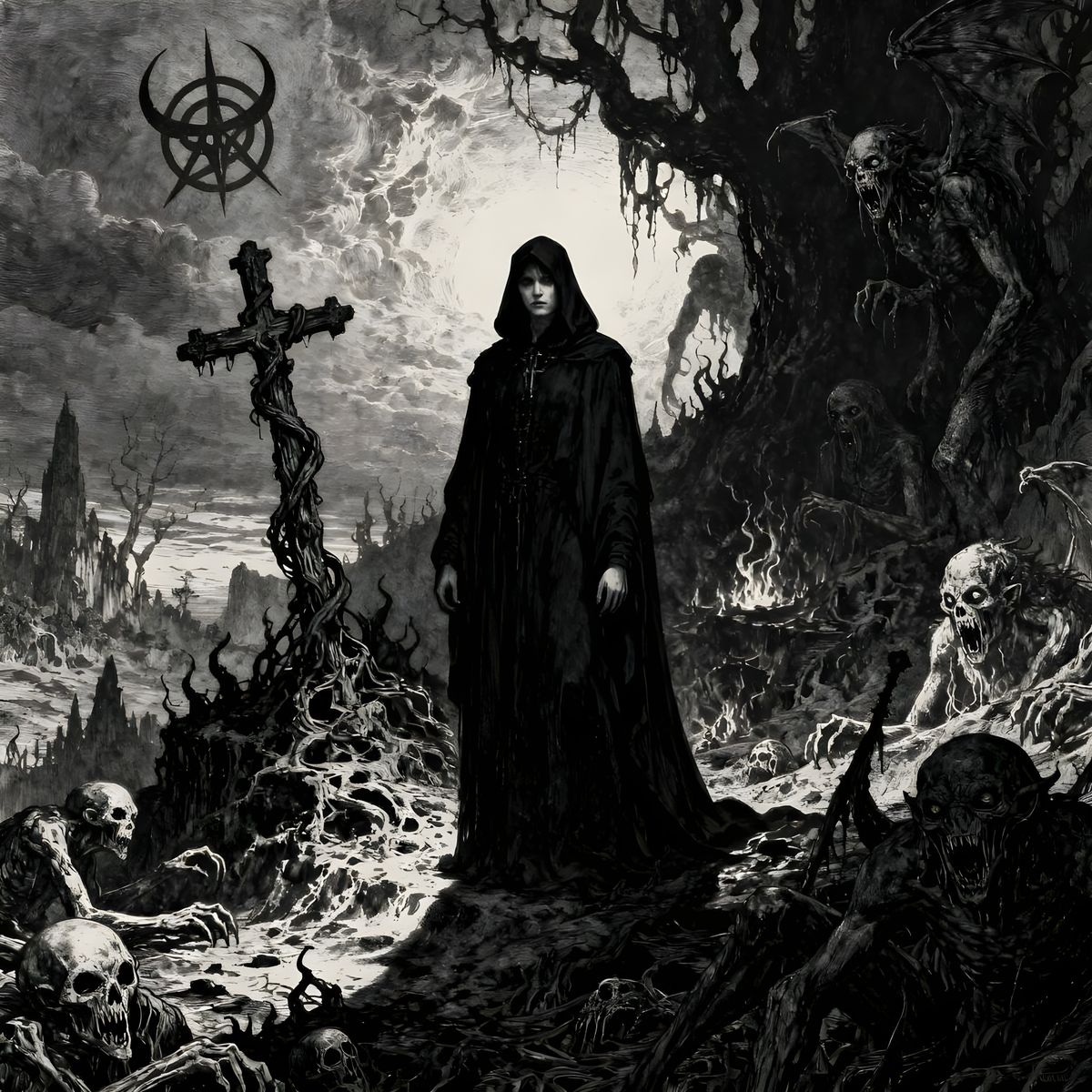 This image depicts a dark, Gothic scene with a black-clad figure amidst hellish landscapes, demons, and satanic symbols. Features eerie, nightmarish, and surreal elements.